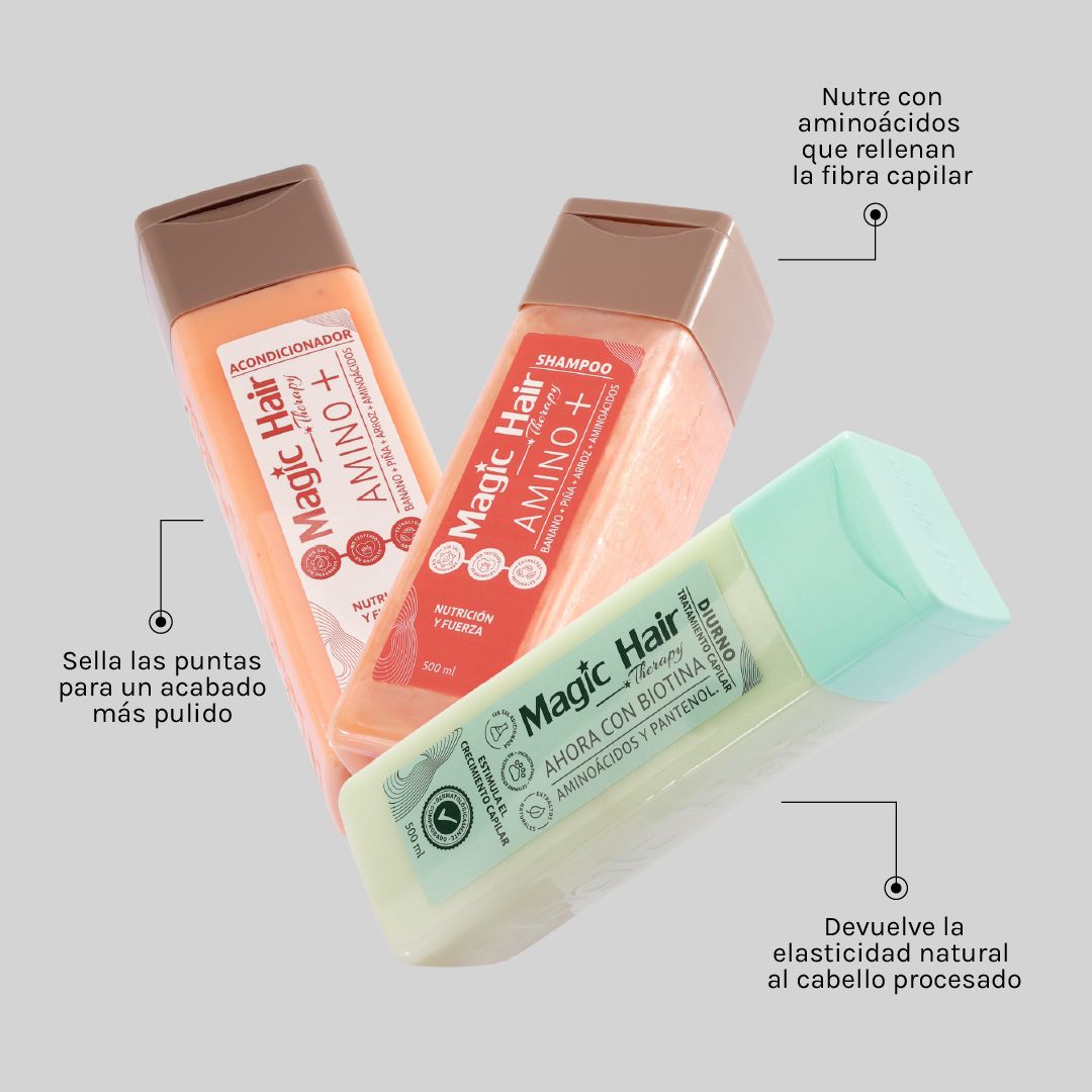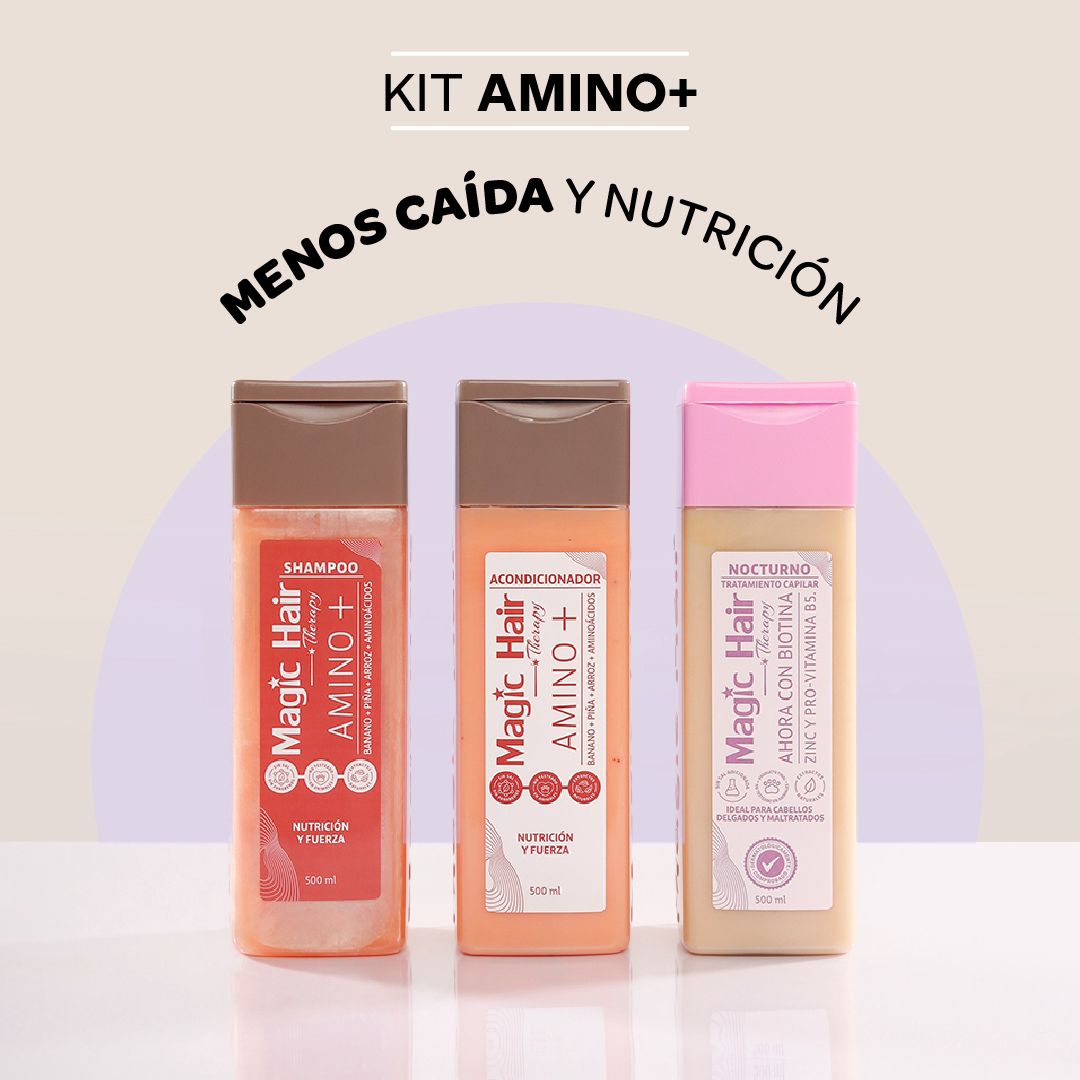 BENEFICIOS: Este kit capilar ofrece una rutina completa de cuidado que limpia, nutre y trata el cabello en profundidad. El shampoo y acondicionador Amino fortalecen la fibra capilar, aportan hidratación, suavidad y brillo, mientras que el tratamiento capilar a elección potencia los resultados según la necesidad del cabello, mejorando su apariencia, resistencia y manejabilidad desde la raíz hasta las puntas.