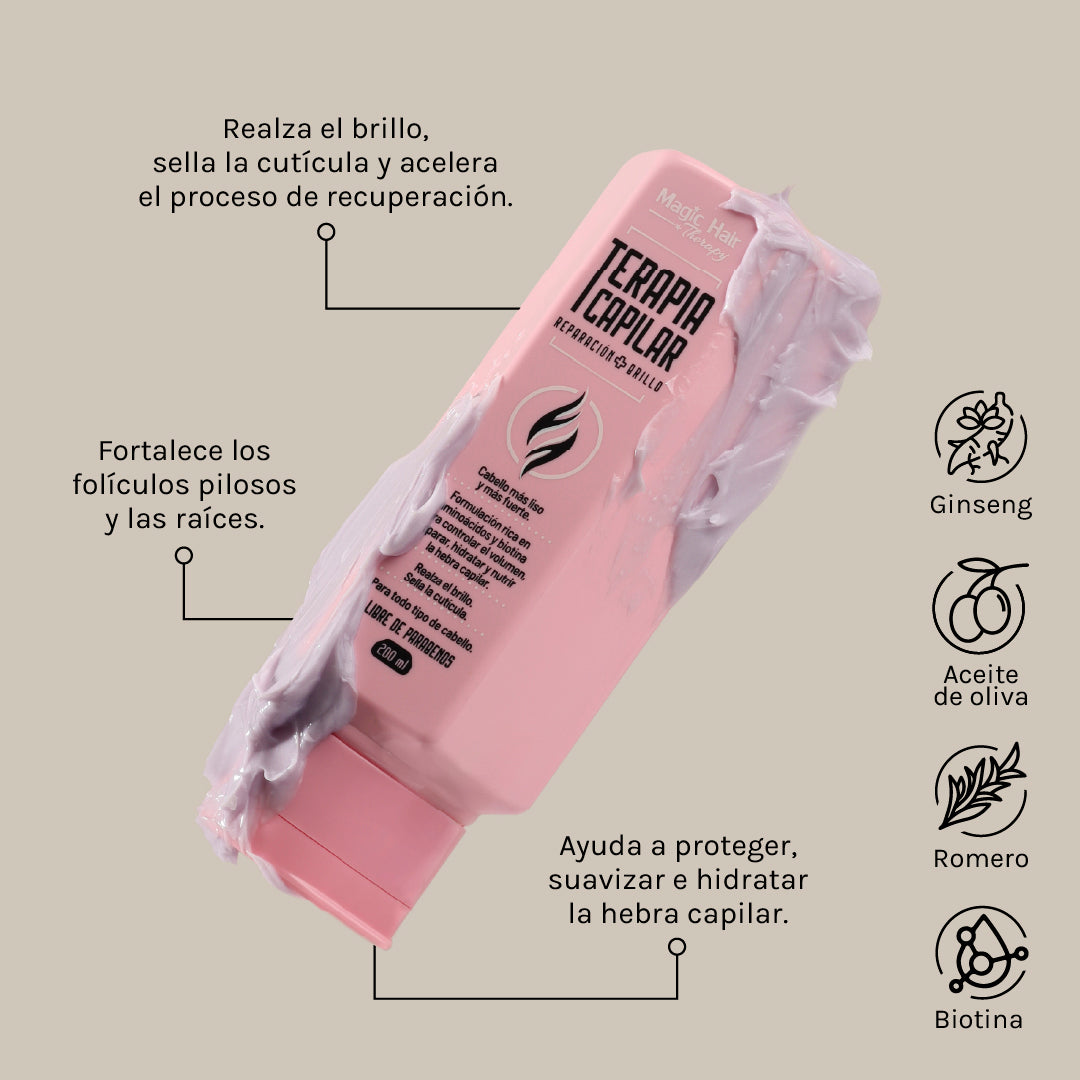 Su función es controlar el volumen, reparar, hidratar y nutrir la hebra capilar. Realza el brillo, sella la cutícula y acelera el proceso de recuperación.